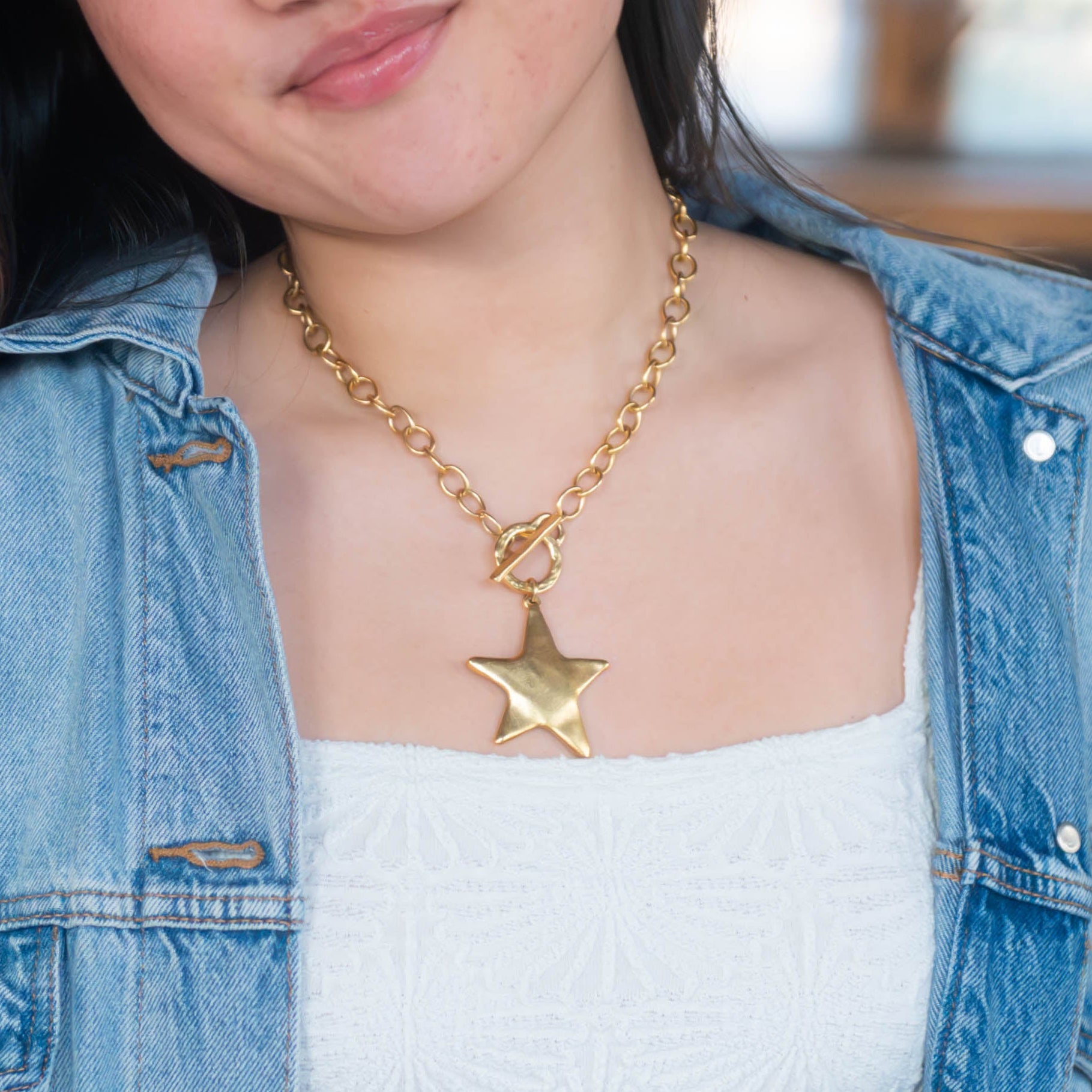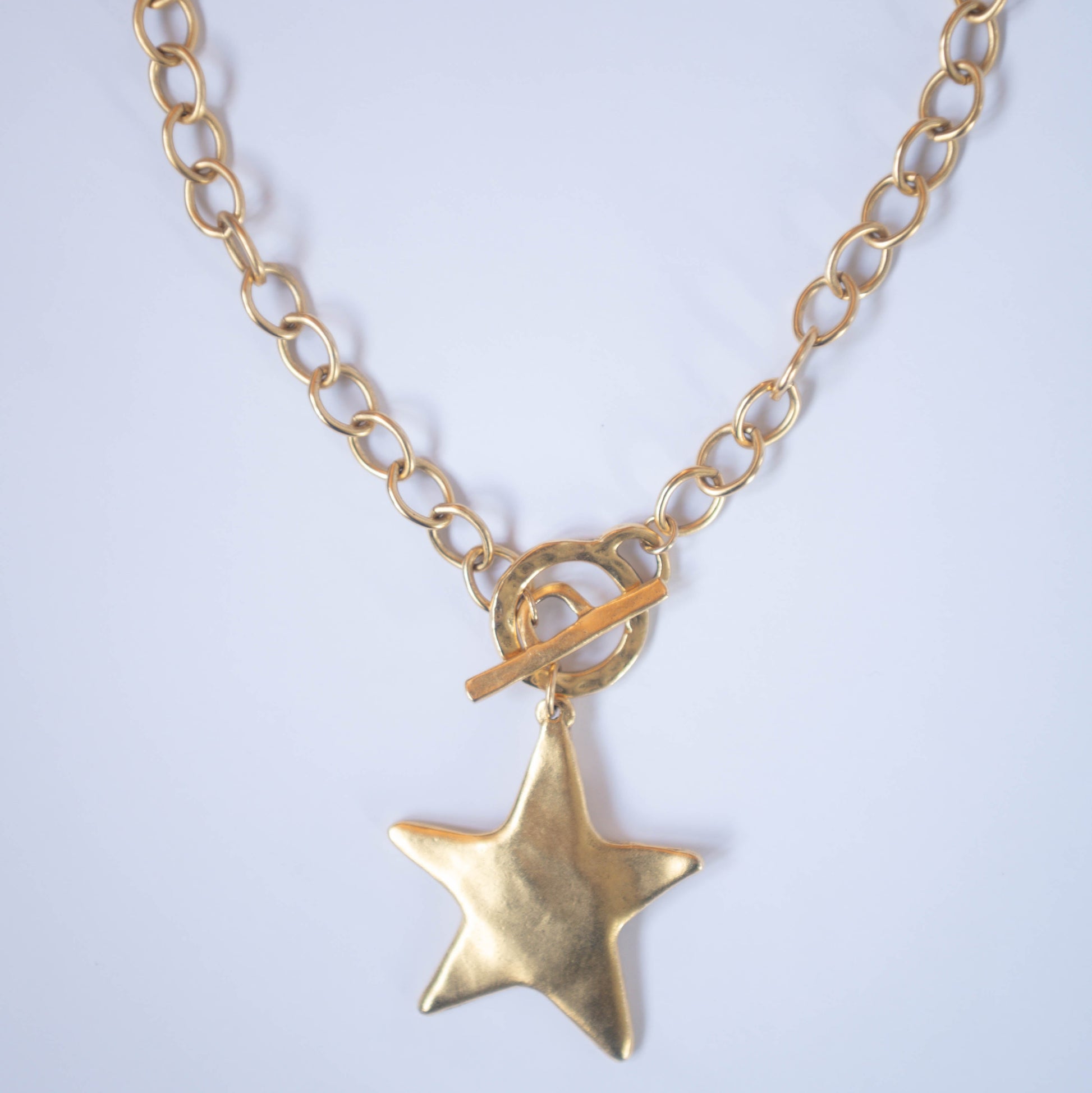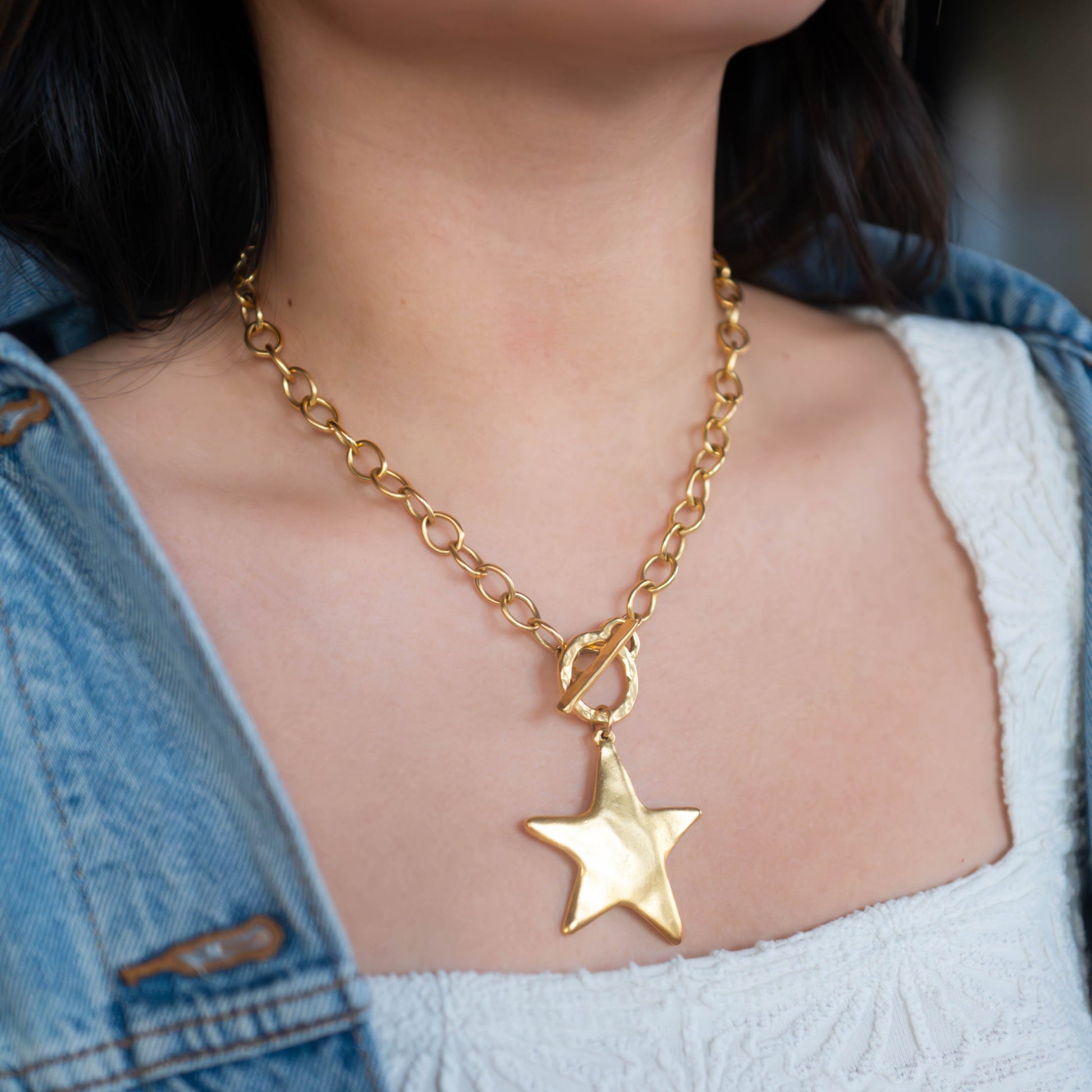 An antiqued gold toggle necklace featuring a bold star charm for a modern, celestial statement look. This trendy chunky chain necklace is perfect for layering and elevating everyday outfits with effortless spring style.
