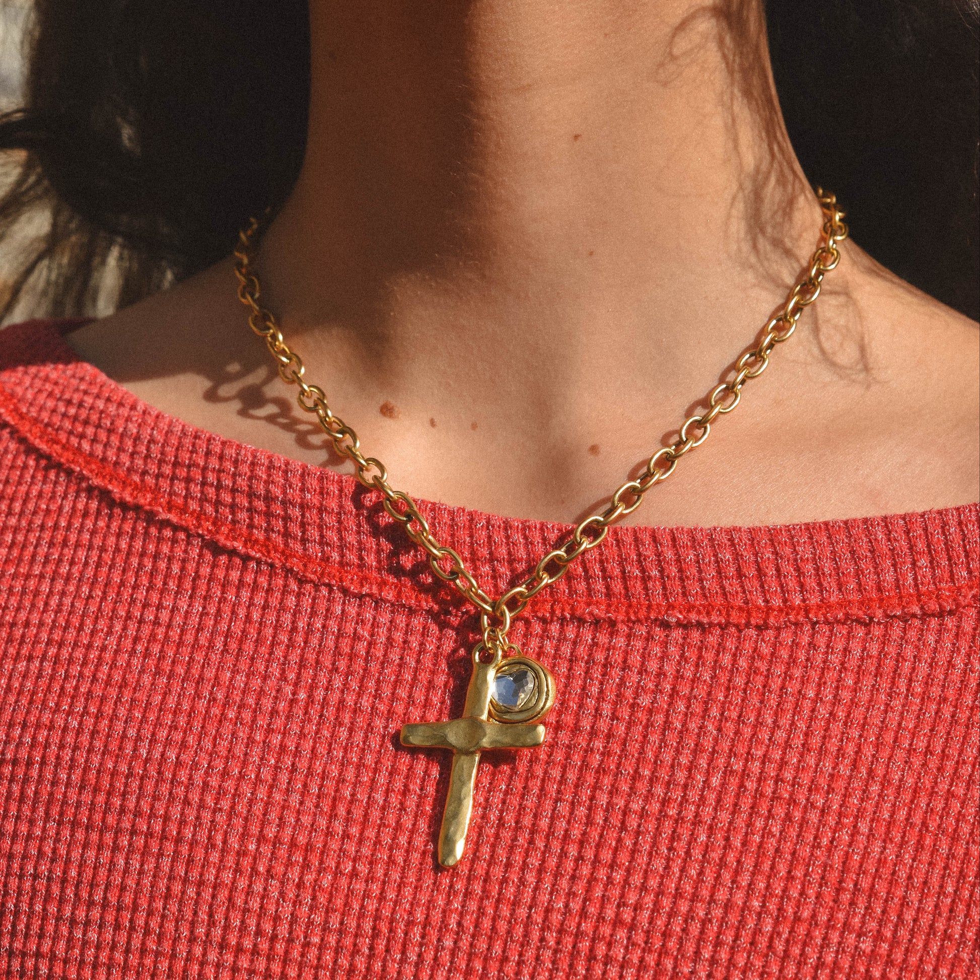 Cross & Heart Gem Pendants on a Gold Chain
