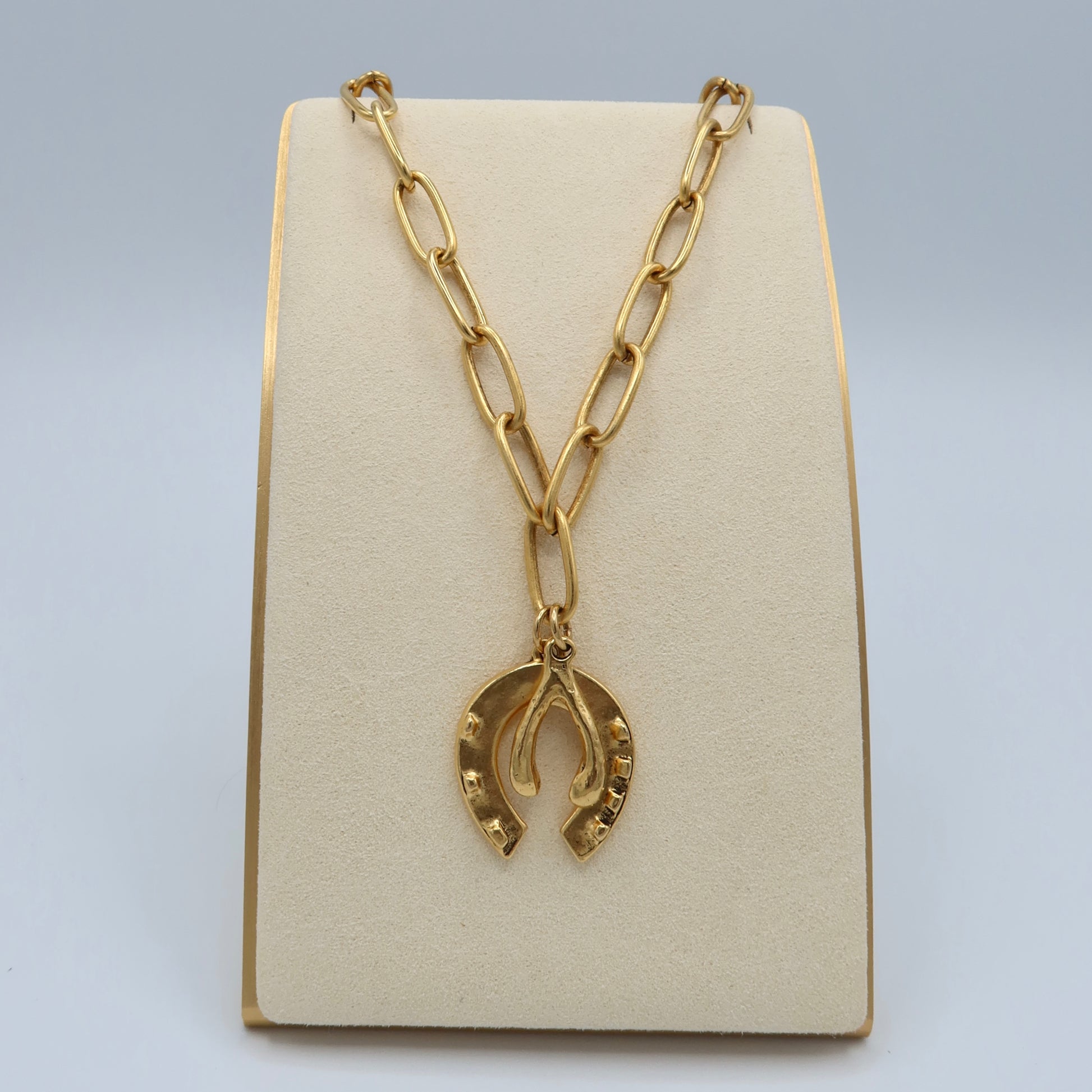 Horseshoe & Wishbone Charms on a Gold Paperclip Chain