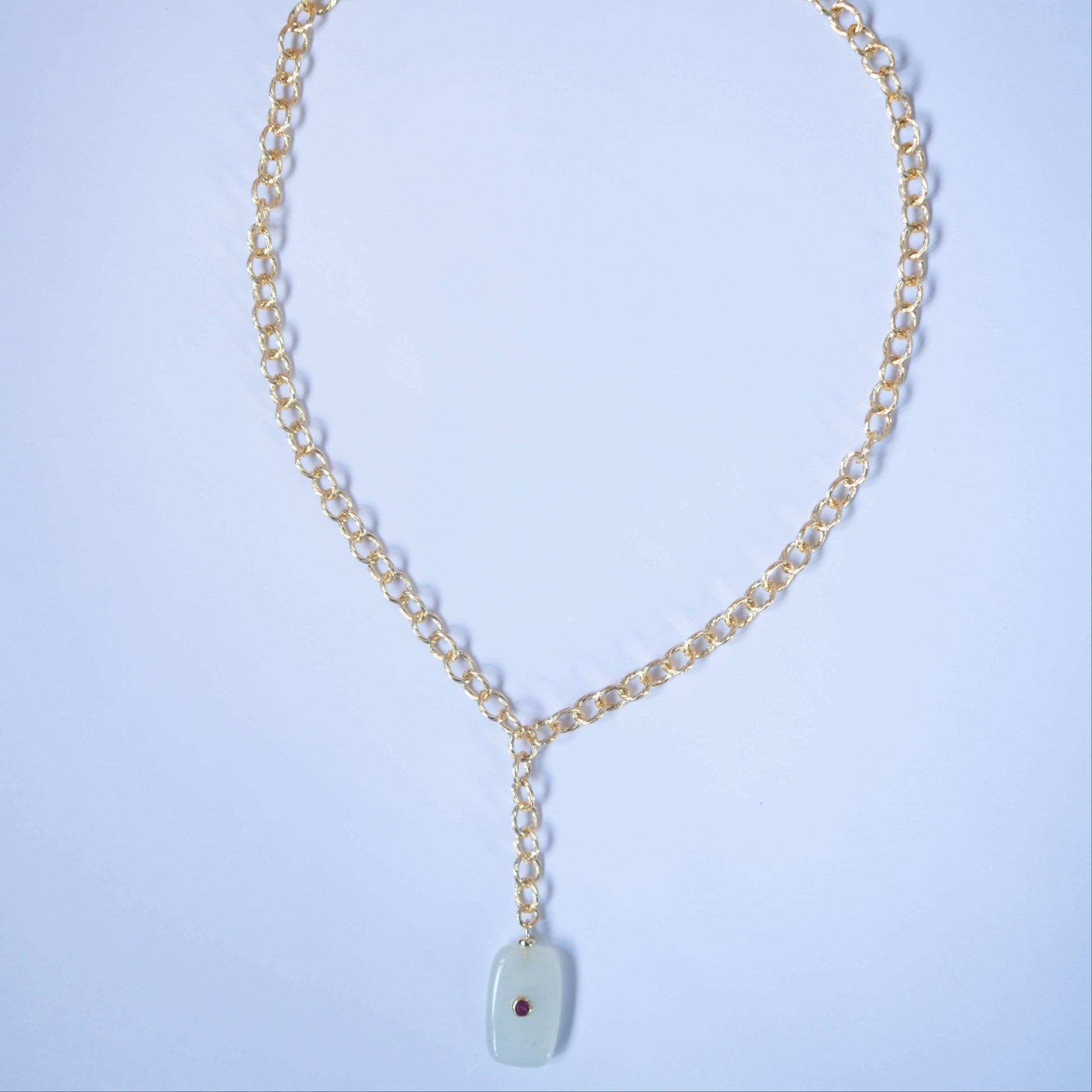 A gold chain necklace featuring a soft white pendant drop with delicate pink gemstone detail for a subtle pop of color. This spring-ready layering necklace blends minimalist gold jewelry with playful charm.