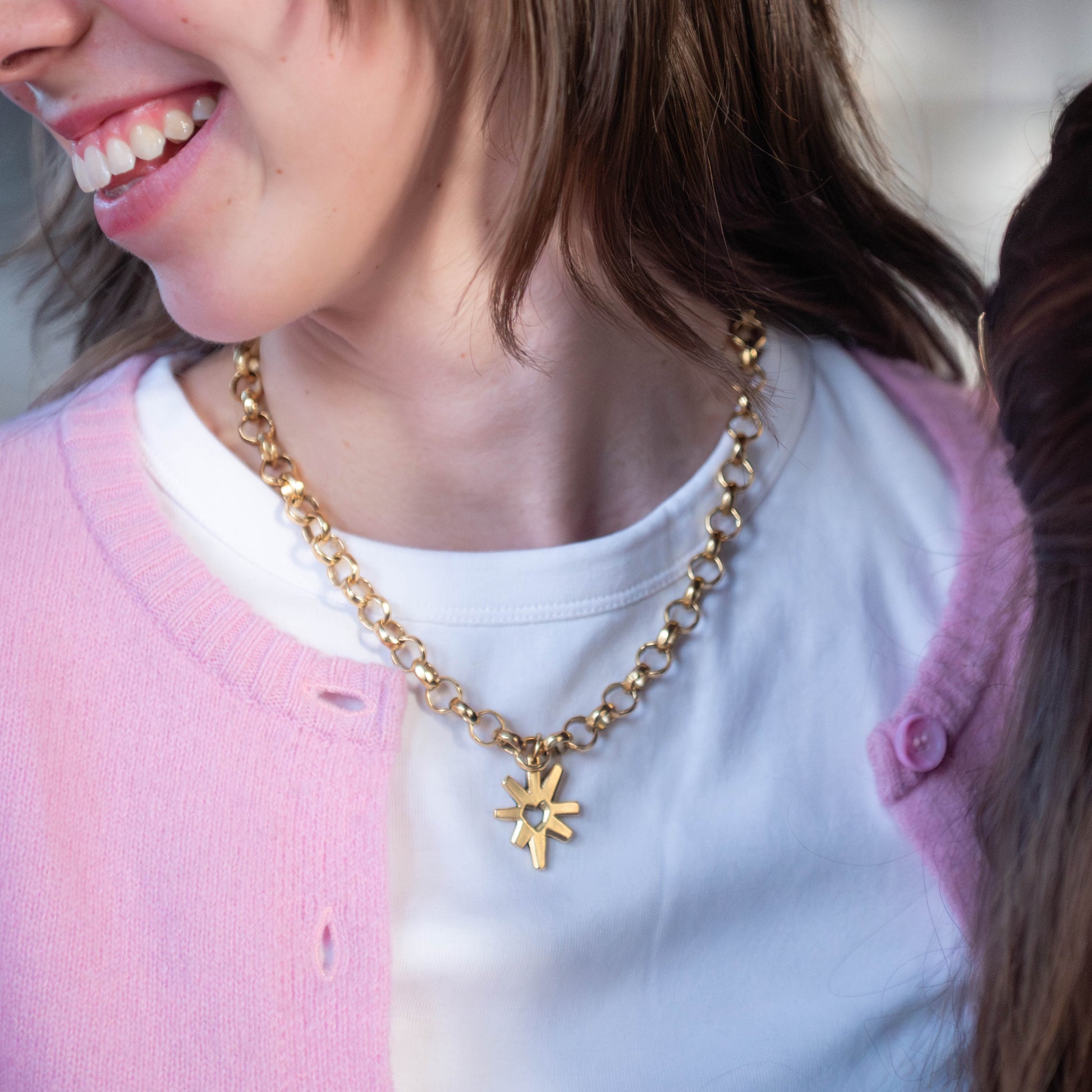 A chunky gold chain necklace with a modern sunburst pendant for a radiant, statement finish. This bold gold necklace layers effortlessly and adds warmth to everyday outfits.
